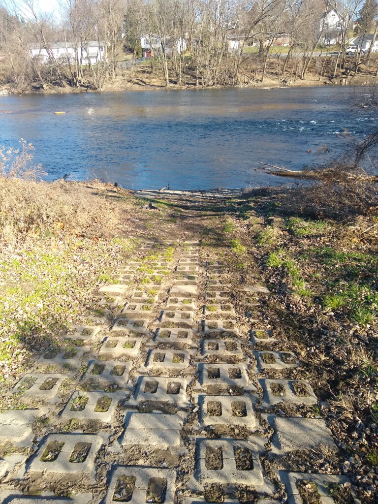 The ramp is accessed by walking past the guardrail to the end of the parking area. The ramp is composed of pavers. The water here is typically fast flowing and may be a difficult access to use for some paddlers.